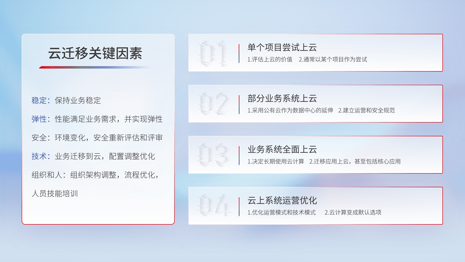 结合实际业务,,从规划设计、、、、云平台选型、、云原生改造、、、数据迁移、、、、集成交付,,,,迁移全过程为客户识别最佳上云路径,,,,做好风险识别管理,,,设计网络架构、、、、身份权限、、、安全审计合规、、、、操作审计、、、日志审计、、、、监控告警策略、、、、多站点容灾设计等,,,对云上基础设施进行整体规划,,,,提升IT治理水平,,以满足弹性、、、、高可用、、、、高性能的需求。。。。