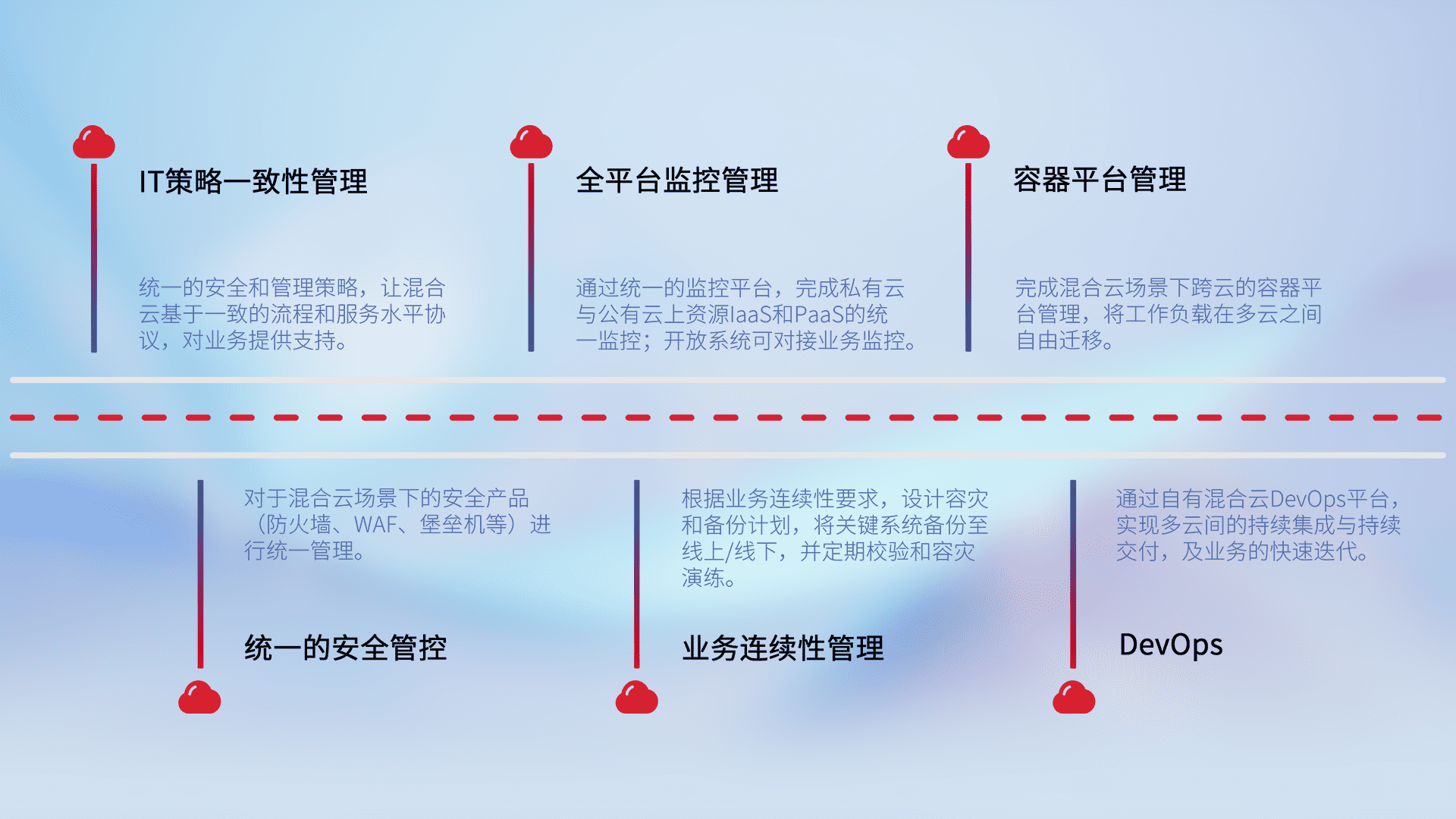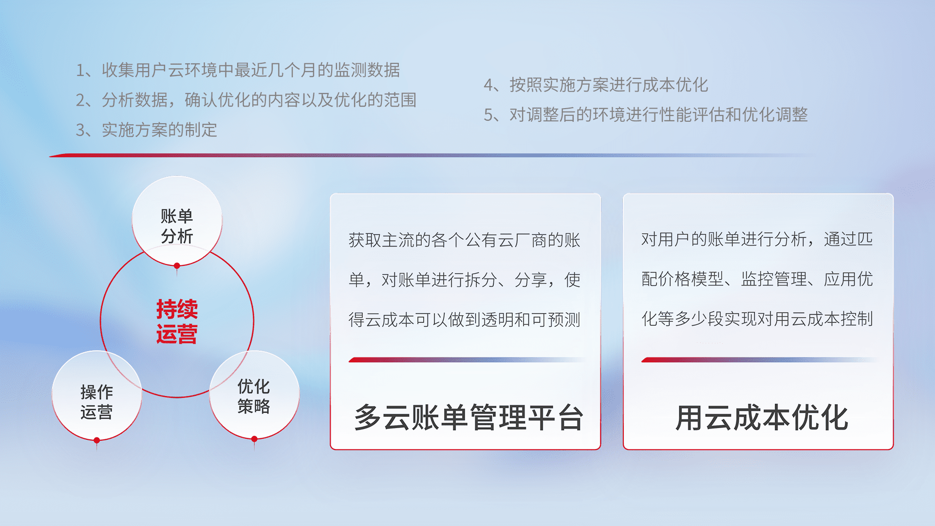 通过多云纳管,,以统一的资源数据模型把客户的云资源进行抽象和封装,,进而实现对多云资源的统一操作,,,,保障云资源管理的可靠性、、稳定性与可用性。。。量身定制化运维内容,,,配置、、、开发运维、、补丁管理、、备份、、、、监控、、、认证和访问管理、、、、审计和日常巡检等,,,保障在用云过程中的可靠度,,,,稳定度以及高可用率。。。