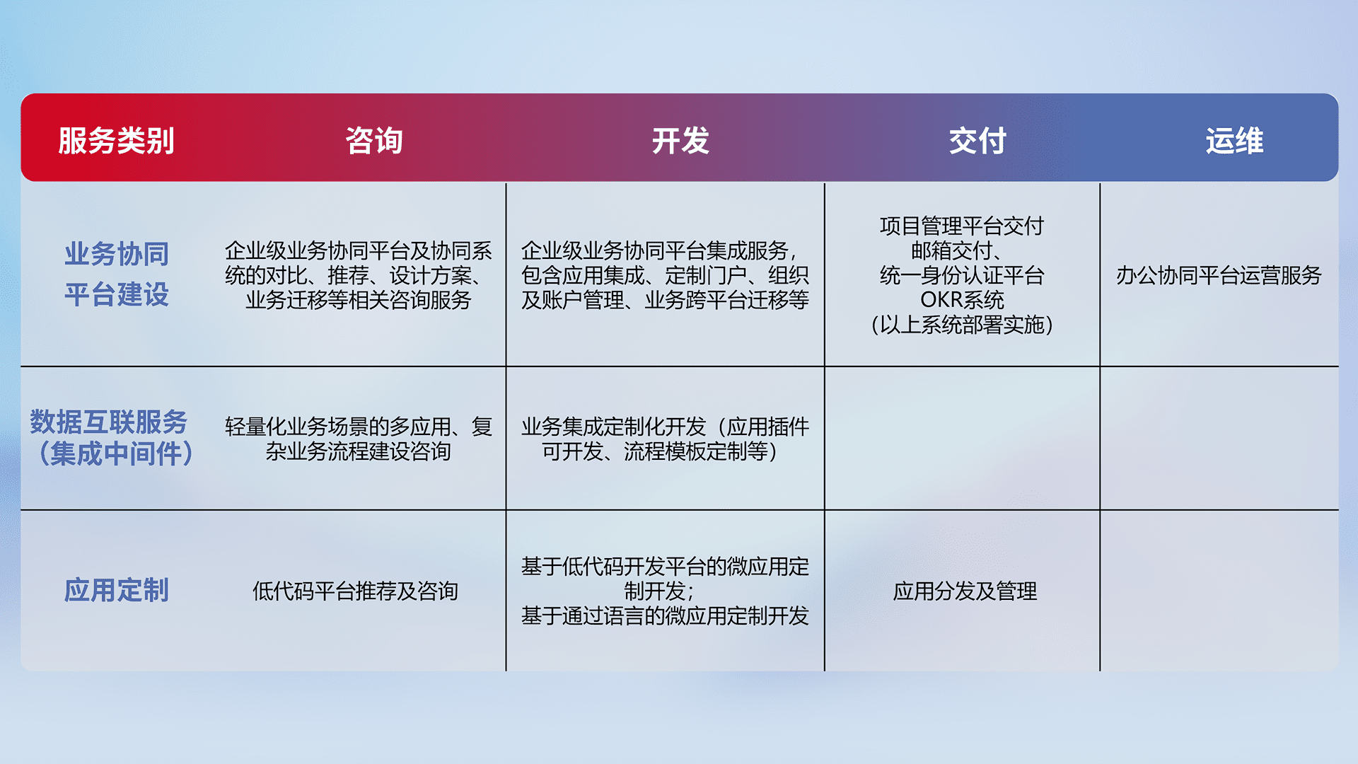 针对钉钉、、、、企微、、IDaas等平台级产品提供产品的规划、、、、方案、、、、交付、、、、定制化开发等服务,,实现如统一协同办公、、智能客户服务、、、、混合会议管理、、、、智能数据查询、、、、等业务场景,,实现数字化转型。。。。